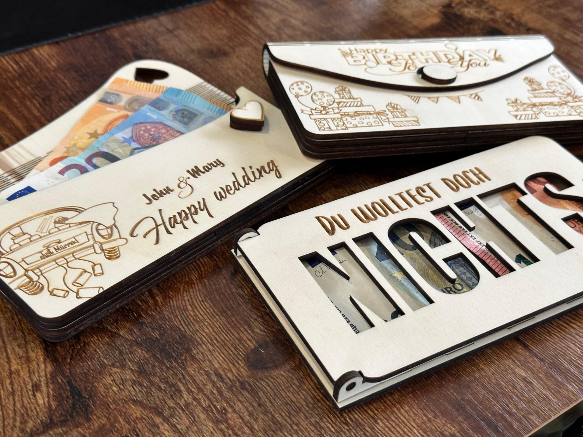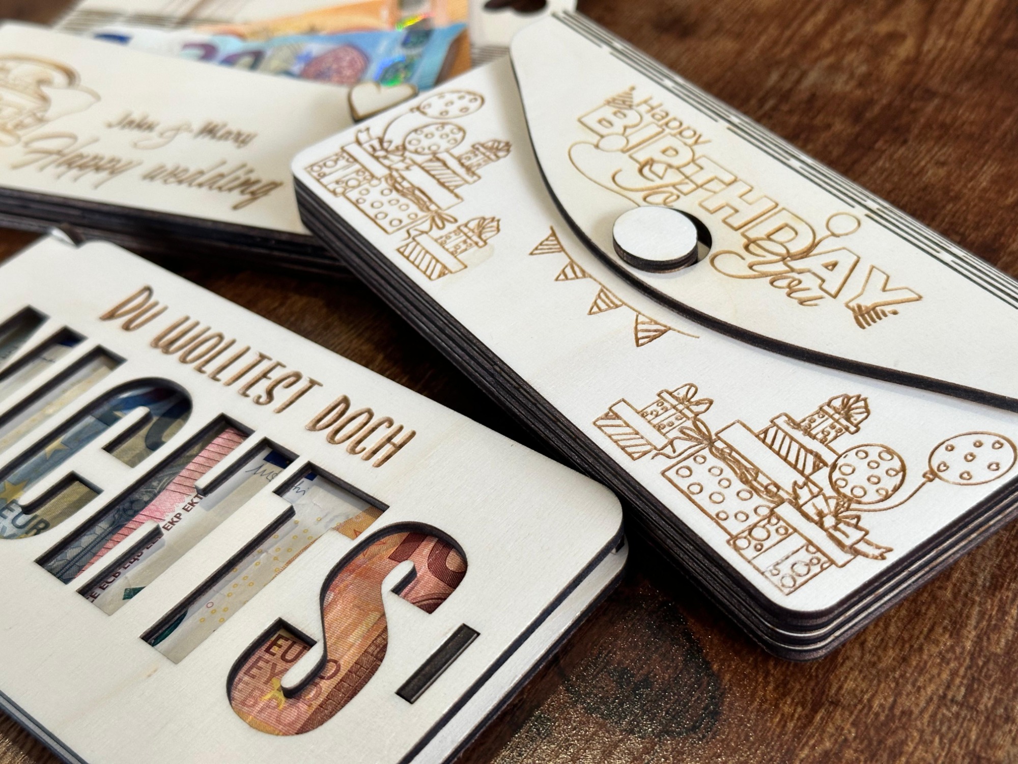 • Lasergravur auf Holz, Glas oder Acryl – perfekt für Schilder, Anhänger oder dekorative Einzelstücke